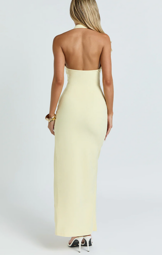 Ruby Maxi Dress - Halter Scoop Neck Low Back Bodycon Dress in Lemon