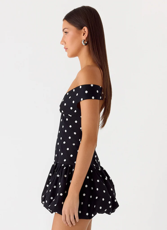 Endless Romance Off Shoulder Mini Dress - Black Polkadot