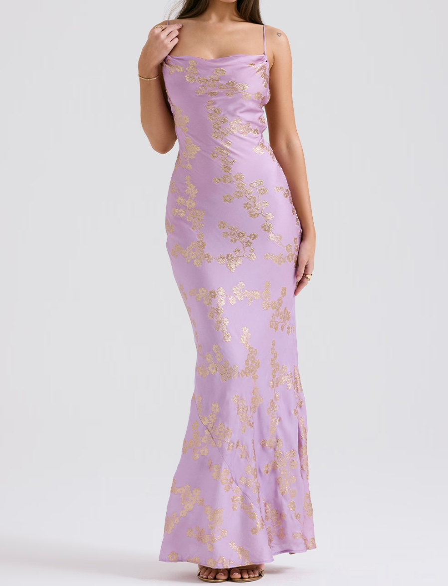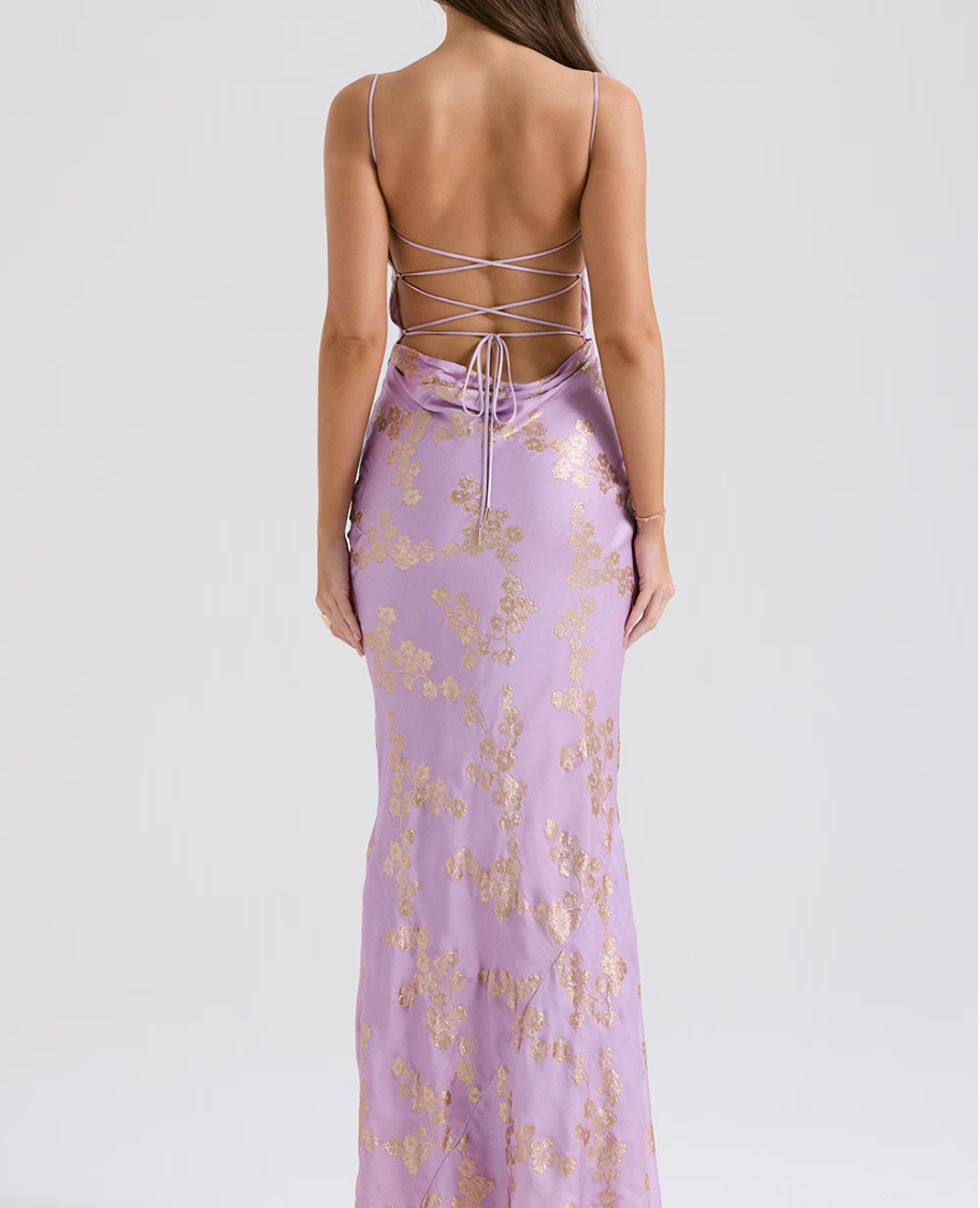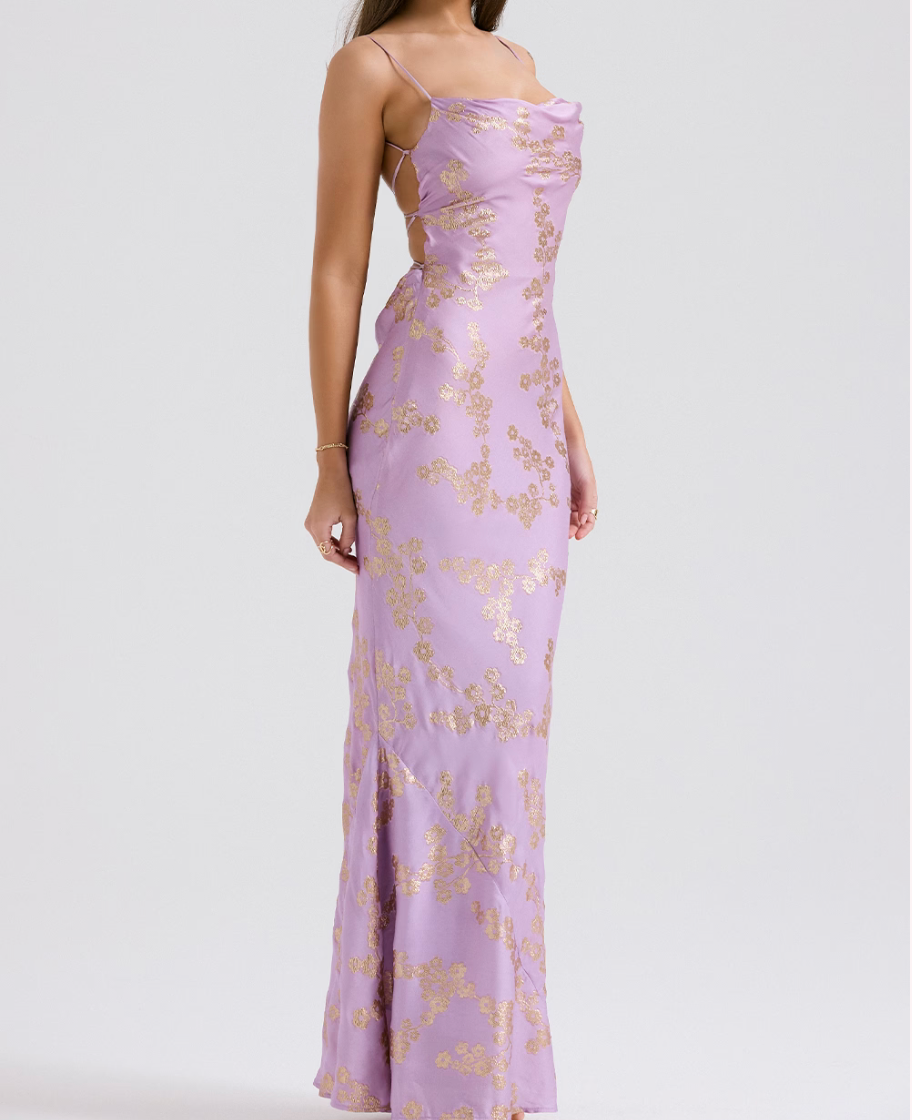 - It's decorated top to toe with glimmering golden florals and the barely-there straps criss cross to delicately trace your back
