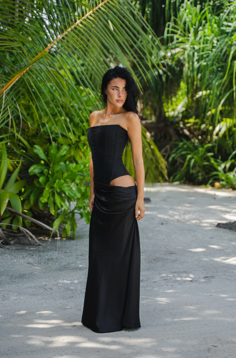 THE FLATTERING CORSET OF LOUIE SHOWCASES INTRICATE BONING DETAIL, SKILFULLY CRAFTED TO CONTOUR THE BUST AND WAIST.