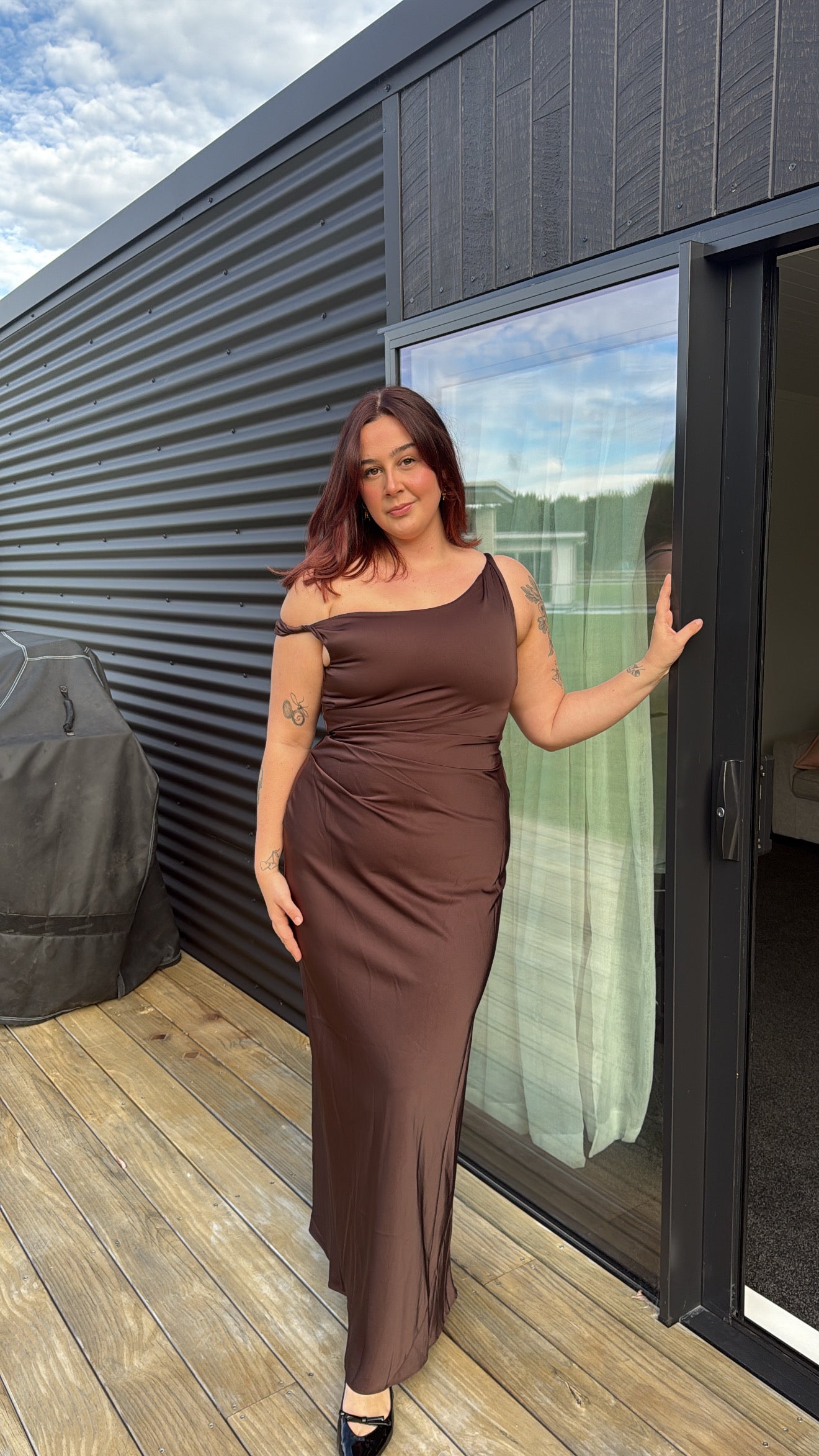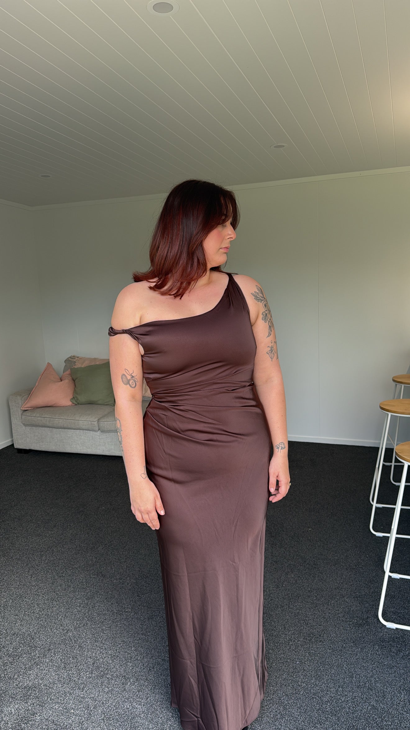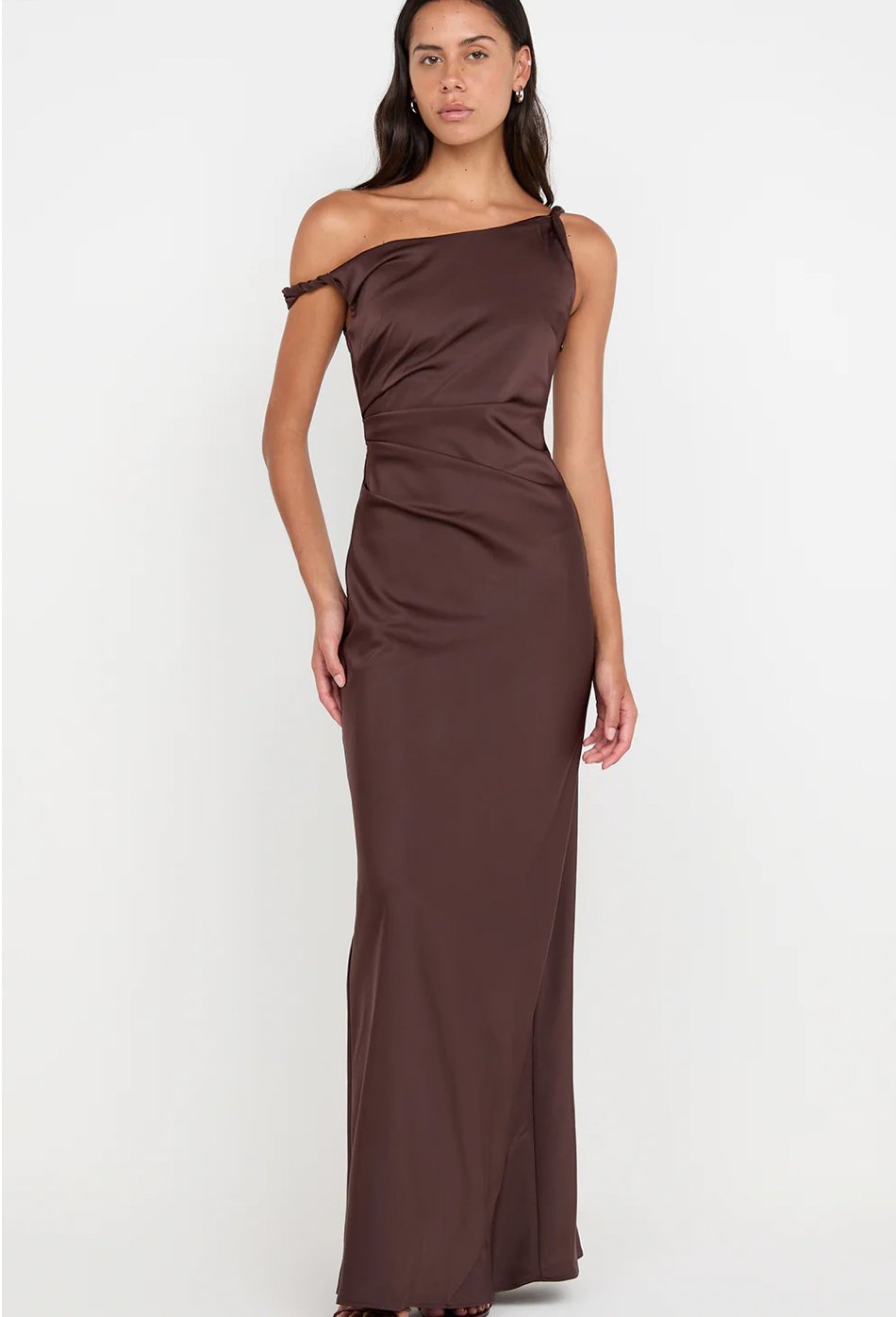 - Fitted silhouette, flowing into a maxi dress