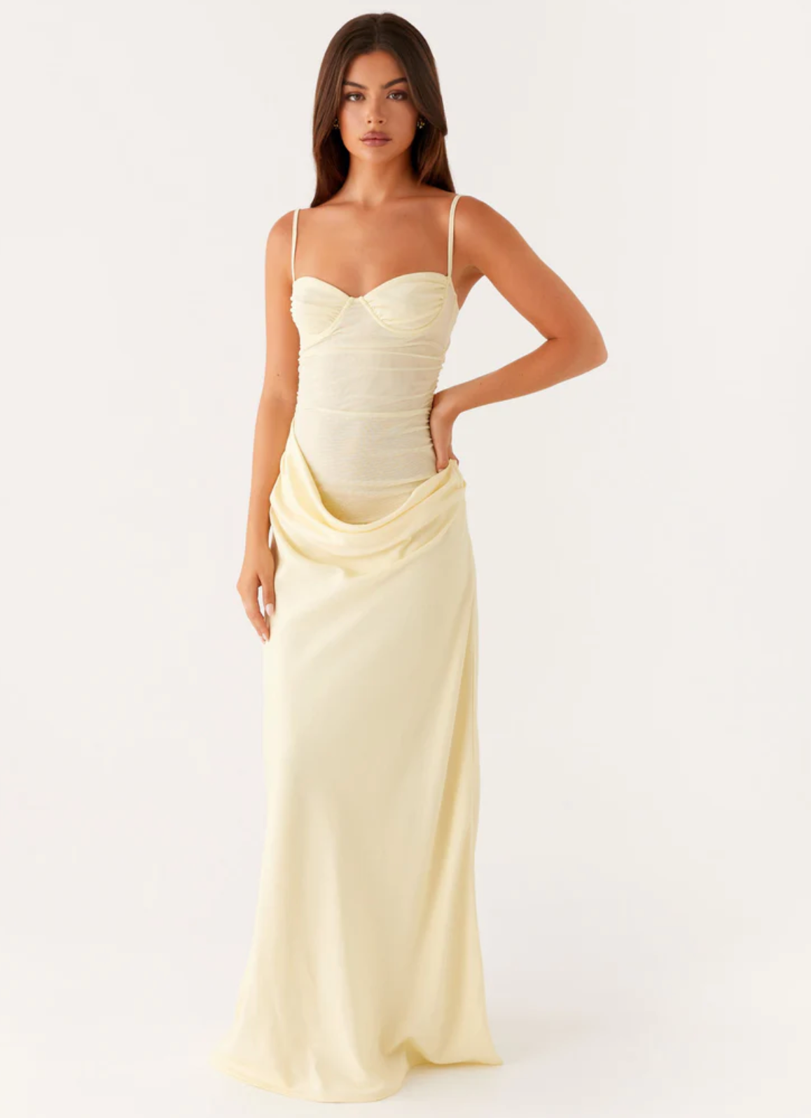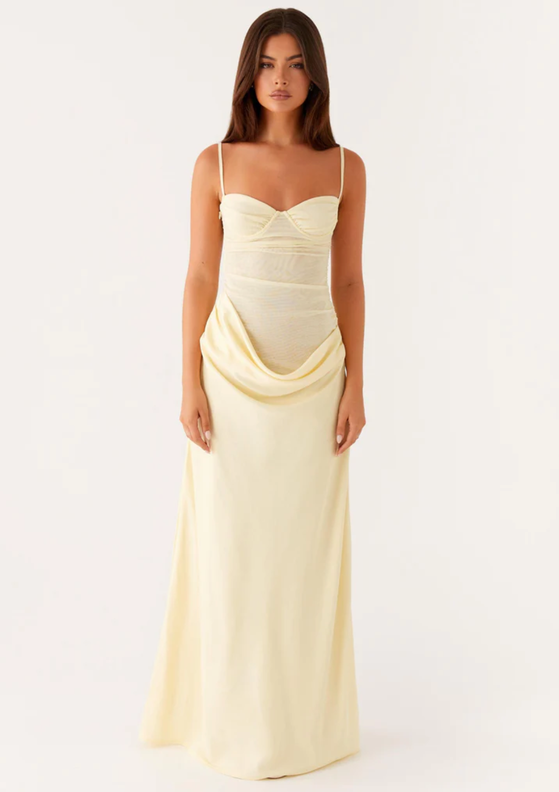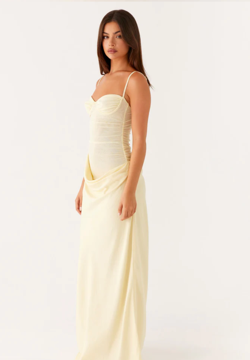 Lift it up when walking outside, refrain from wearing bracelets or bags that may pull on the material. Avoid any sort of nail glue, polish or ink. Hang the dress up.
