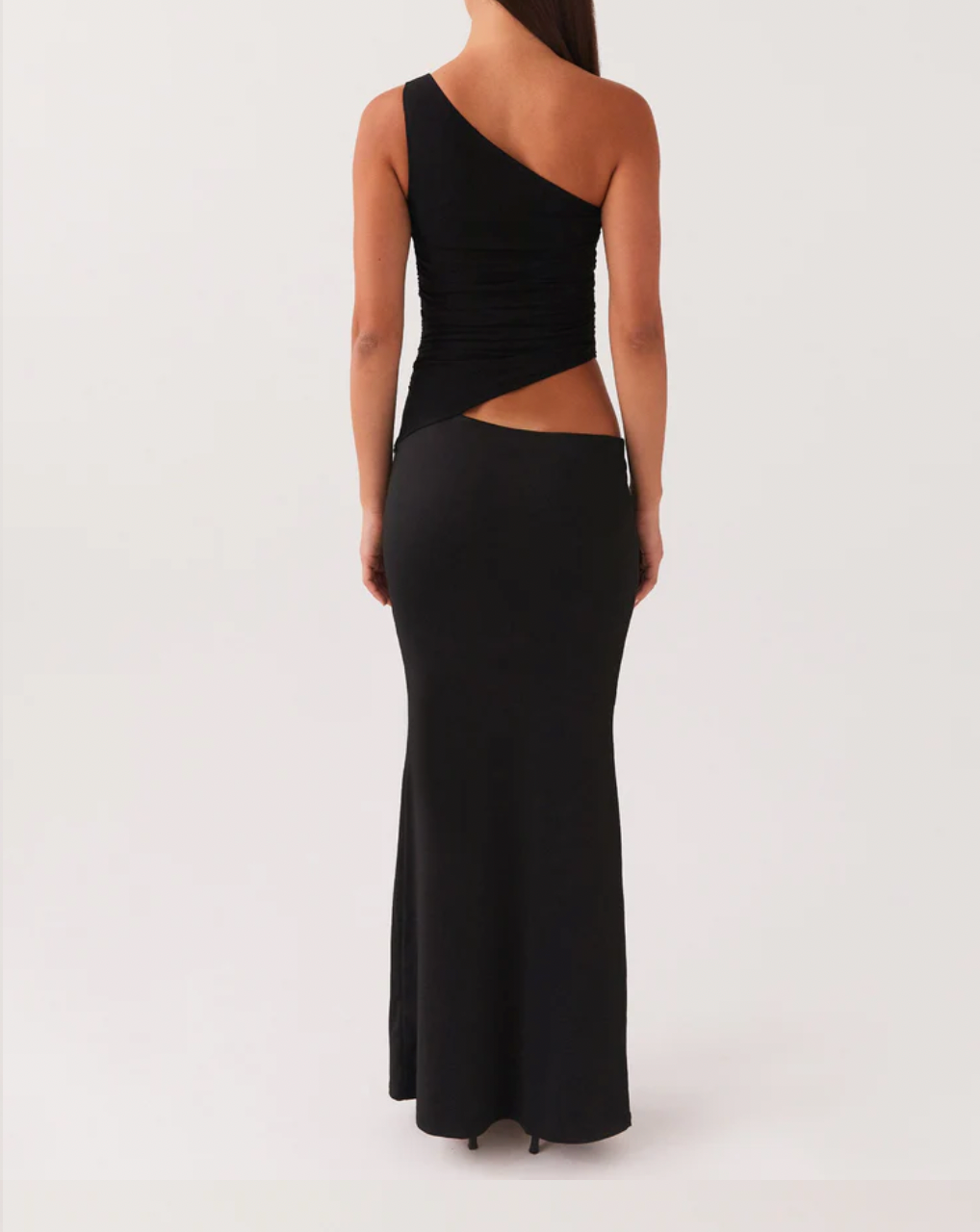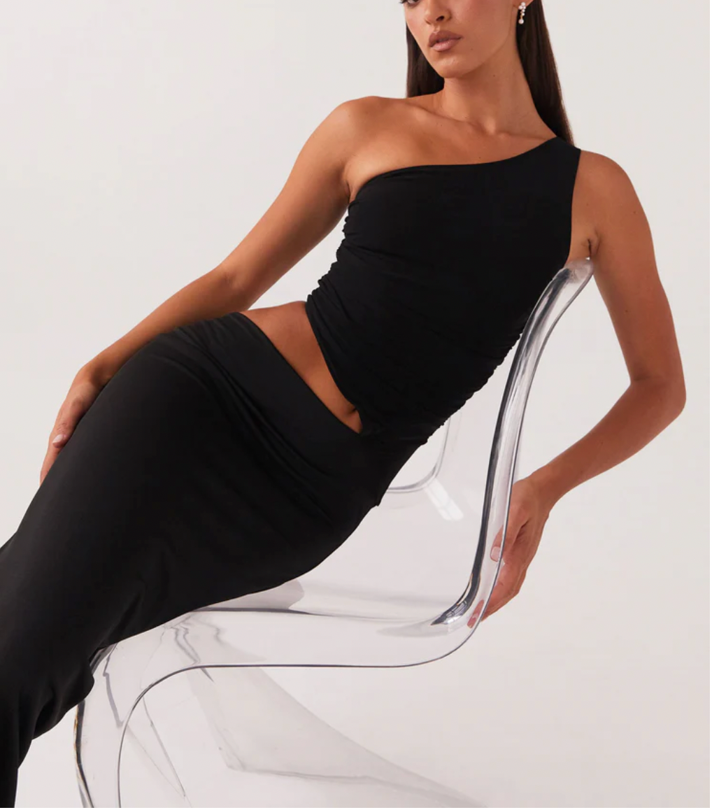 - complemented by a sleek jersey skirt and a chic cut-out at the waist