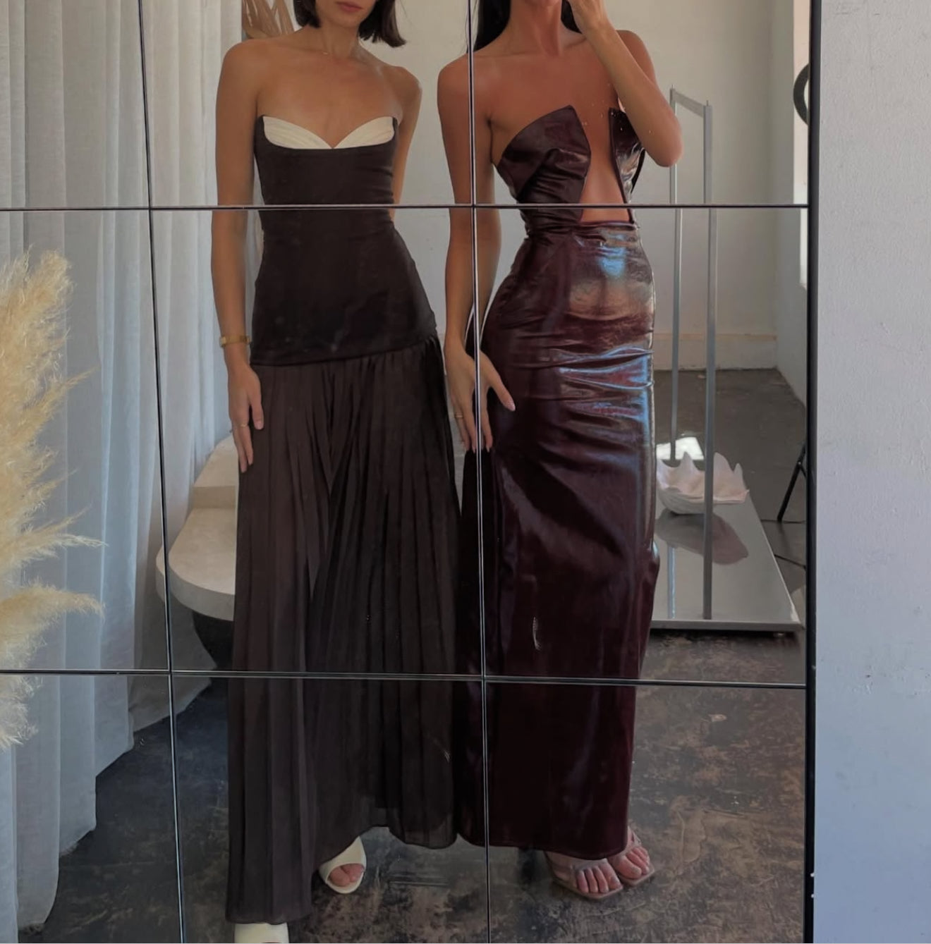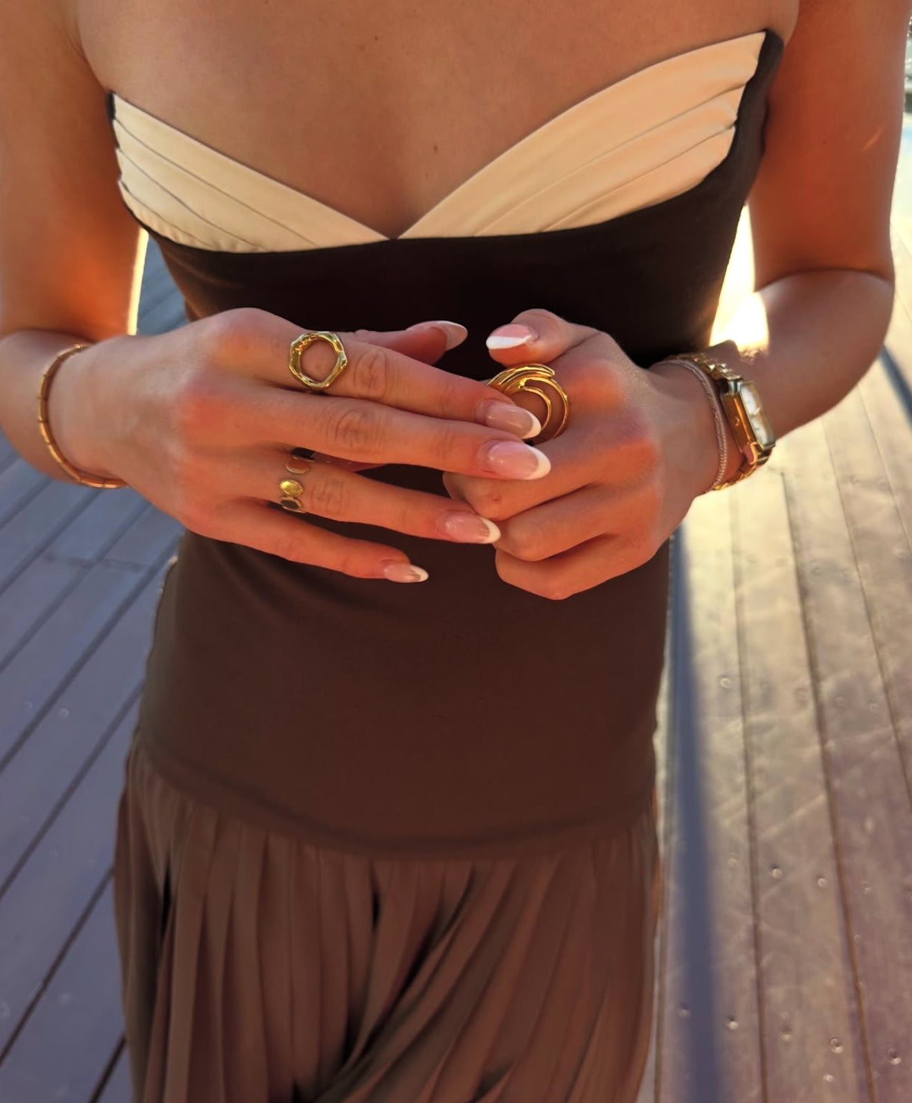 Lift it up when walking outside, refrain from wearing bracelets or bags that may pull on the material. Avoid any sort of nail glue, polish or ink. Hang the dress up.
