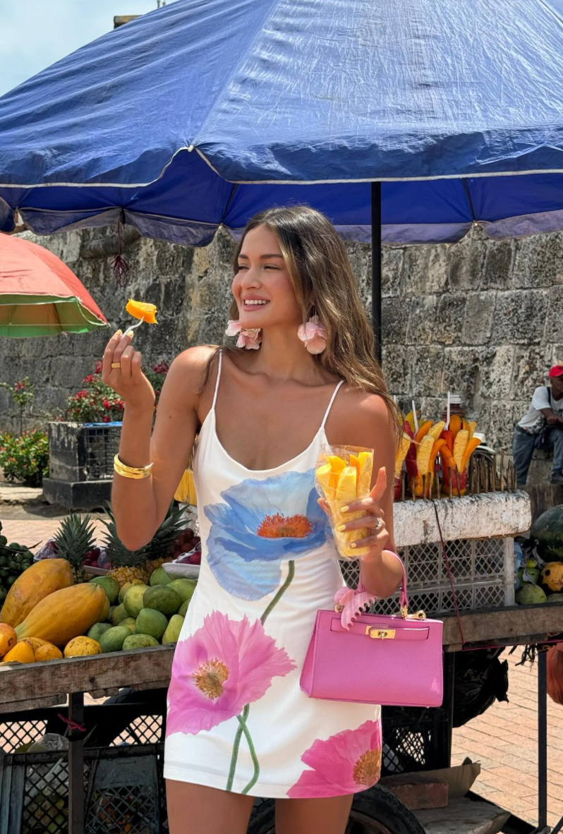 - Stunning white Mini dress, adorned with vibrant poppy florals print and a Low Back